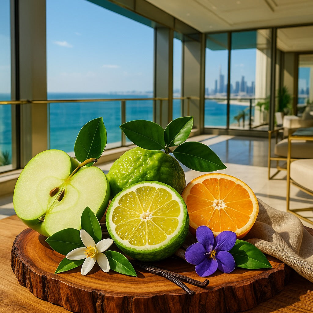 Entre la brisa salina, se esparce la suavidad de la cachemira y un toque de violeta, mientras las maderas elevan la escena hacia un lujo sereno y sofisticado.