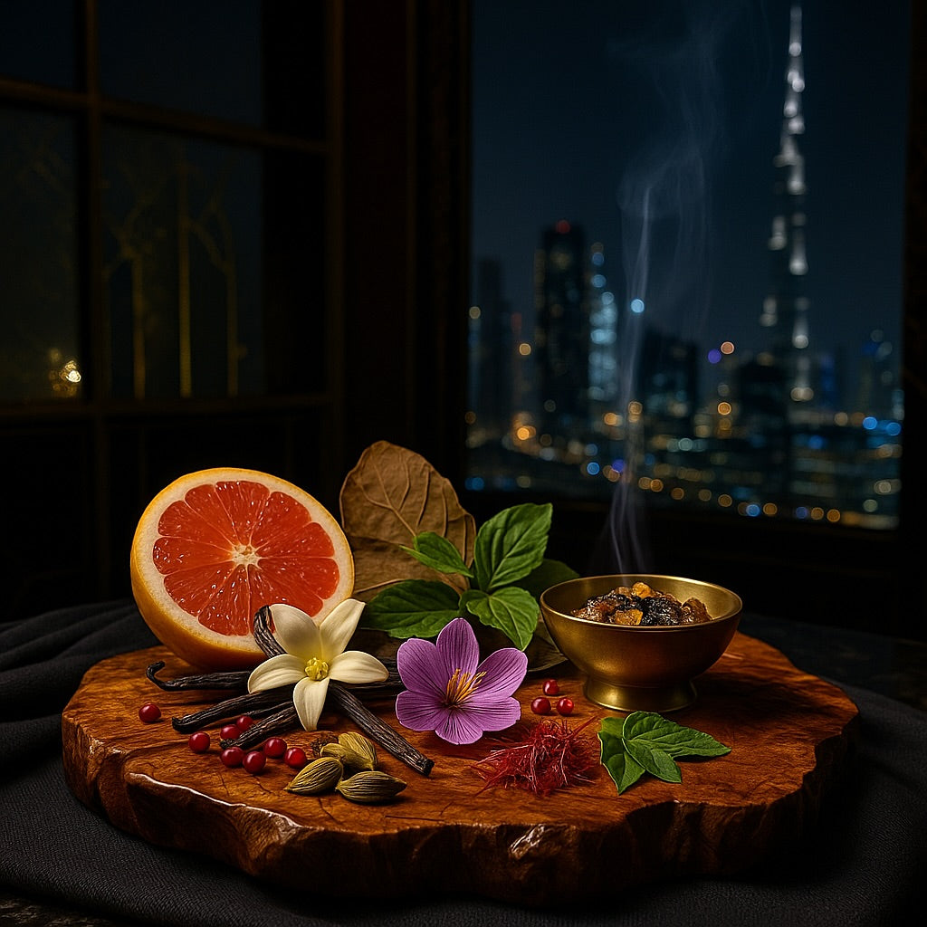 Un aire de toronja recién cortada se mezcla con el resplandor del azafrán y el picor leve de la pimienta rosa. Entre las notas cítricas se abre paso un humo dulce de tabaco y vainilla, que se adhiere a las maderas y deja una sensación envolvente, profunda, casi hipnótica.