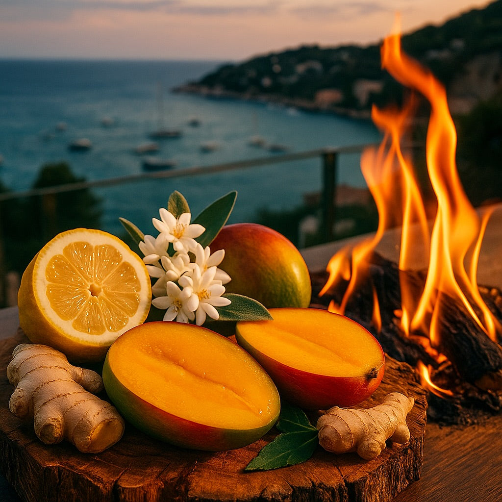 Sobre una lujosa pieza de madera, mangos maduros derraman su dulzura en el aire, entrelazados con una brisa cítrica y picante de limón y jengibre.