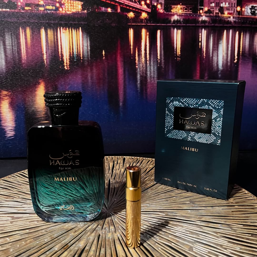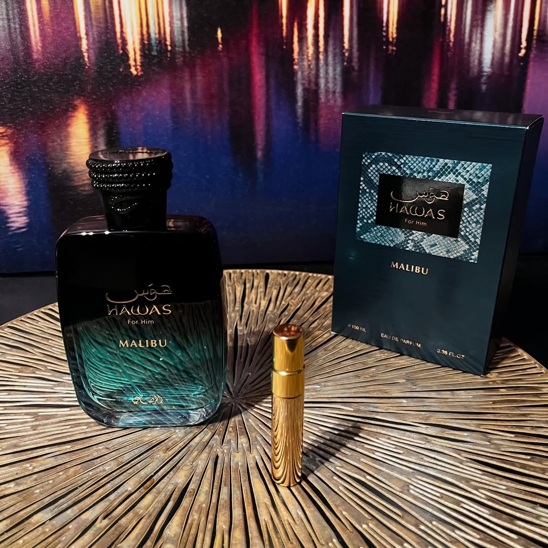 Hawas Malibú evoca una noche en un rooftop exclusivo frente a la playa, donde la piña madura y la naranja se encuentran en el aire, entremezclándose con la salinidad del mar, la calidez del ámbar y un rastro suave de lavanda, creando una atmósfera lujosa, vibrante y magnética.