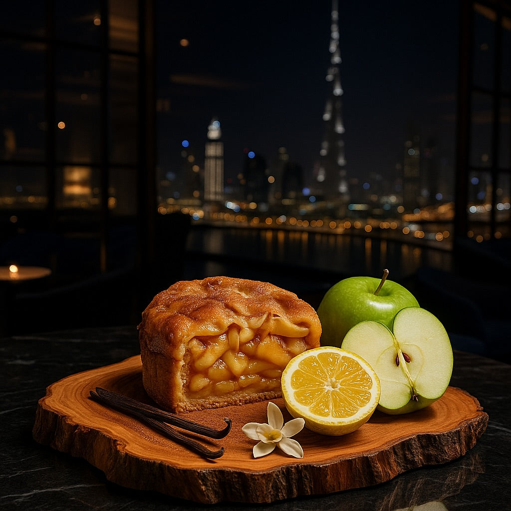 El ambiente se inunda con el instante preciso en que un pastel de manzanas se derrama sobre una base de madera de cedro de altísima calidad, dejando escapar un dulzor avainillado que perfuma todo alrededor. Entre esa dulzura surge el frescor brillante de las ralladuras cítricas, que flotan en el aire y completan la escena con un contraste vibrante. Hayaati transforma el espacio en un festín de lujo árabe.