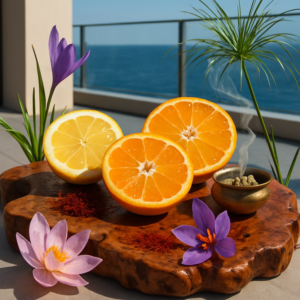 El inicio despliega yuzu, bergamota, naranja dulce y mandarina, un estallido cítrico vibrante que ilumina la escena antes de hundirse en un corazón especiado de nuez moscada, flor de loto, cardamomo, canela y azafrán: un torbellino exótico que aporta calidez y sofisticación.