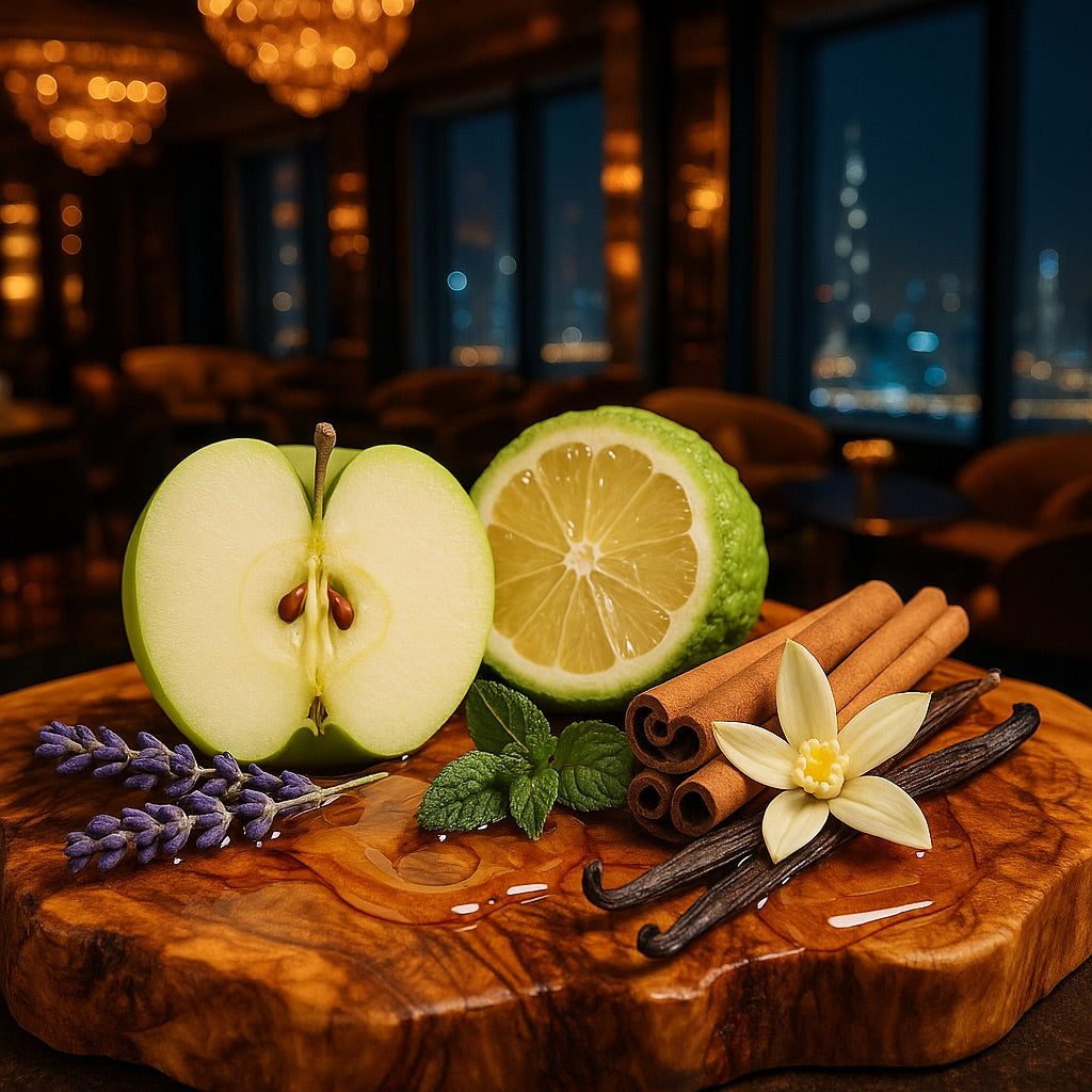 Sobre una mesa de lujo, una copa se derrama con manzanas especiadas y ralladura de bergamota, mientras un hilo de canela perfuma el aire.