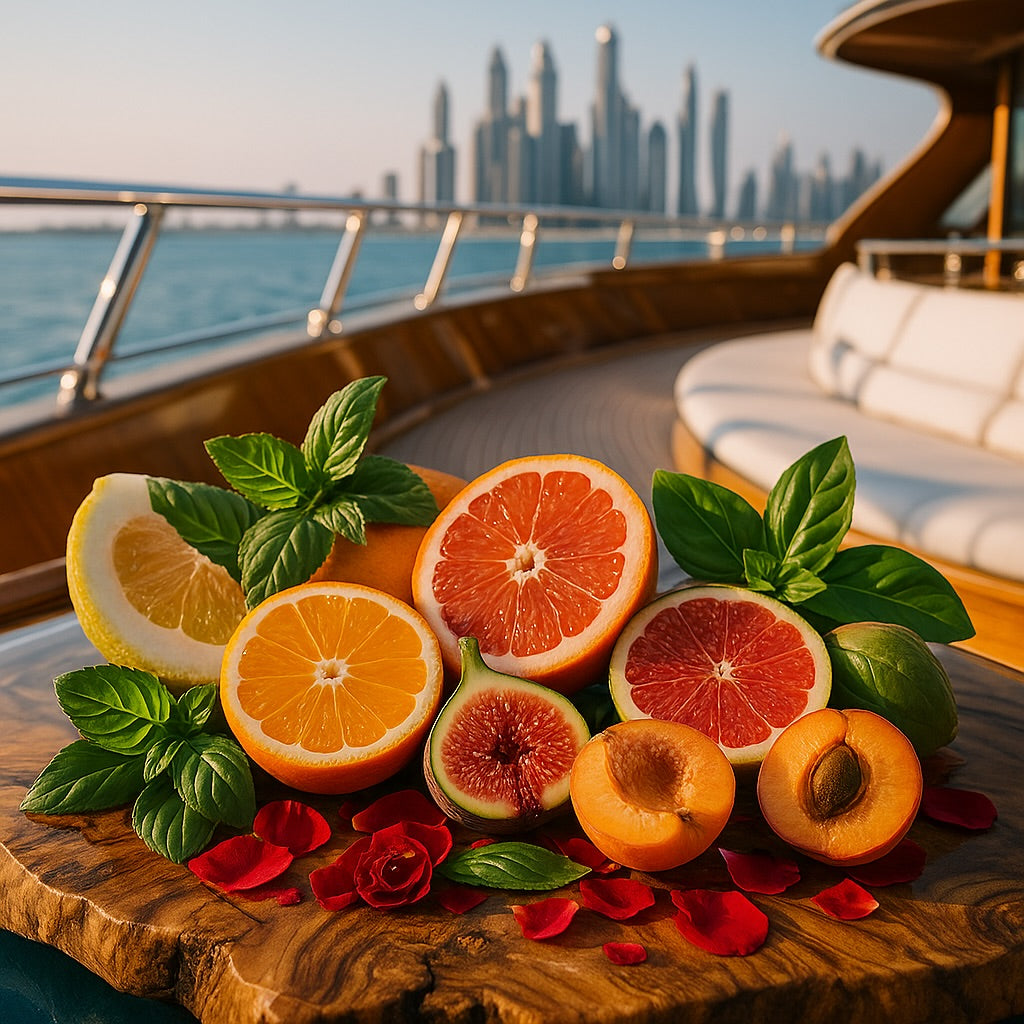 El aire vibra con una frescura que parece venir del océano. La brisa lleva acordes de cítricos brillantes y hojas húmedas, mientras el perfume dulce del higo recién partido se mezcla con el resplandor de la menta.
