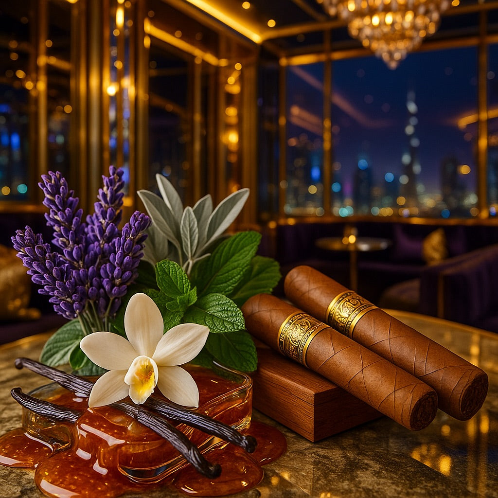 Una bocanada de menta, salvia y lavanda irrumpe en el aire, fresca y vibrante, para enseguida entrelazarse con el humo dulce de tabaco y vainilla. La mezcla se vuelve magnética, sostenida por resinas oscuras que envuelven el ambiente con un aura intensa y lujosa.