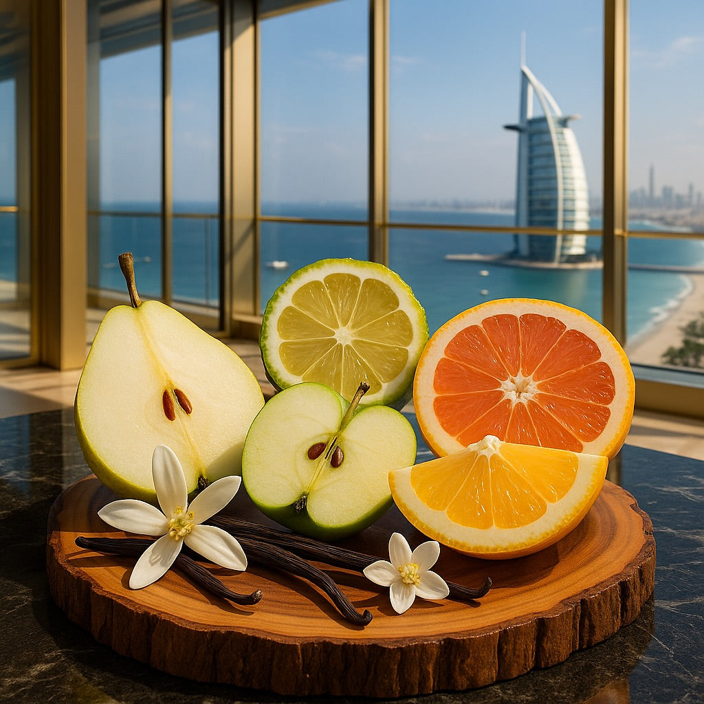 La fragancia podría describirse como una pera jugosa que descansa sobre una base de cítricos recién cortados. Un hilo de vainilla los envuelve como un velo dulce, mientras las maderas dejan en el aire un lujo árabe que transforma la fruta en adicción pura.